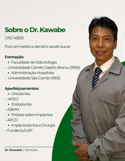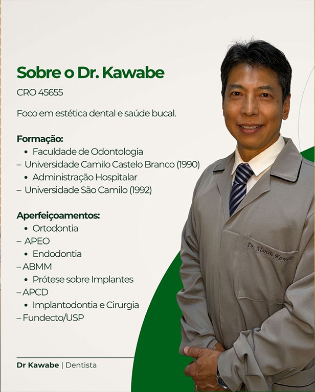 Formado em 1990 pela Universidade Camilo Castelo Branco, o Dr. Kawabe construiu uma trajetória sólida e consistente na odontologia.